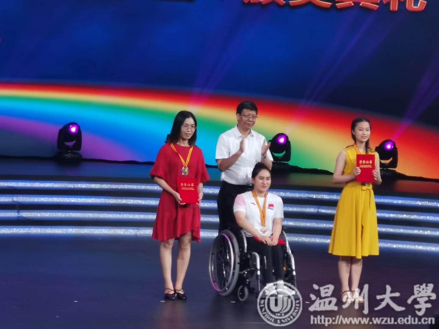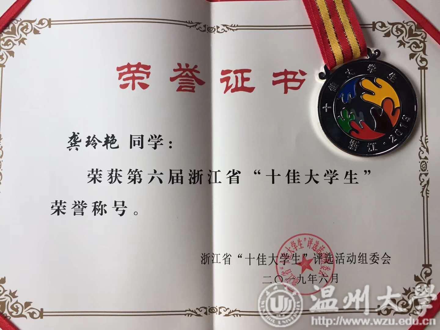 浙江省教育厅厅长陈根芳为龚玲艳同学颁发“省十佳大学生”奖章及证书