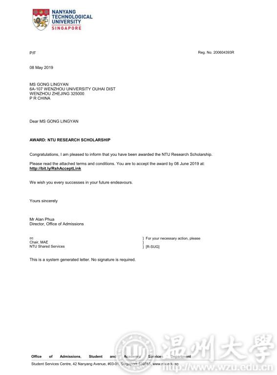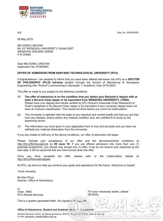 51吃瓜 15级机械工程(国际化)专业本科生龚玲艳,在李子瑞教授的精心培养和指导下,成功获得新加坡南洋理工大学博士录取(机械与航天航空工程51吃瓜 ),并获该校全额奖学金(NTU RESEARCH SCHOLARSHIP)。