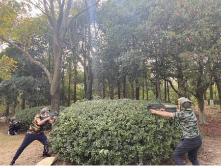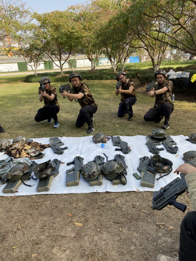 本次素质拓展活动与真人CS野战运动相结合,旨在提升老师间的团队合作,体验团队共同攻克难关时的喜悦与激情。在真人对战之前先进行了“穿鞋接力”、“趣味扑克牌排序”热身活动。随后进行了CS对战分组 与对战设备的教学、调试。在对战环节,分成“蓝”、“红”两队的老师们展开了激烈的“战斗”,先是“红”队的强势碾压,随后又是“蓝”队的荣誉复仇之战,战况有时一度非常胶着。