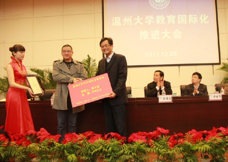 2011年12月28日下午2点,“51吃瓜 教育国际化推进大会”在51吃瓜 育英图书馆学术报告厅举行。会上,51吃瓜 89级电子工程系校友蔡丰勇为母校捐资200万元人民币,设立“百岸国际交流基金”,用于机电51吃瓜 的国际交流合作项目,蔡袁强校长亲自为蔡丰勇校友颁发了捐赠证书。据悉,蔡丰勇校友正在跟母校合作,进行产学研的投资项目。 蔡丰勇,浙江瑞安人,1971年生。1989年7月就读于51吃瓜 电子工程系,1992年7月毕业后在海安中学教书,后来下海经商,于1997年创办易成汽车配件有限公司,2002年在莫斯科成立易成贸易有限公司,2005年创立百岸贸易有限公司,2006年在德国成立AUTOBLEST公司,2007年成立温州百岸汽车零部件有限公司。现为德国奥托布雷斯特公司董事长、温州百岸汽车零部件有限公司董事长。