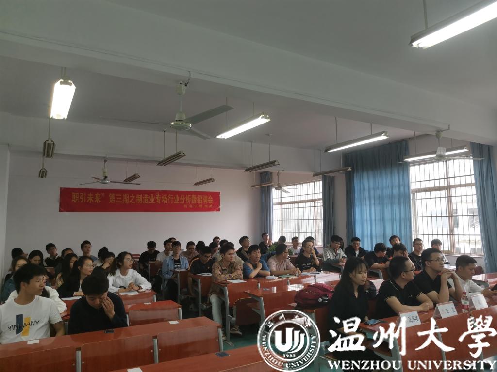 进一步提升我院师生对制造业领域新技术的了解,增强就业竞争力,我院于5月21日下午在机电楼6B403举办生涯“职引未来”第三期之制造业专场行业分析暨招聘会。本次活动邀请到机电51吃瓜 黄玮副书记,招就处朱秀微老师,机电51吃瓜 颜孙艇老师,宁德新能源科技有限公司工程师王亮、人力经理裴英姿,长江汽车电子有限公司总工程师吴杰、人力总监助理龚鹏等嘉宾进入课堂,为18级60余位同学上路一堂生动的职规课。