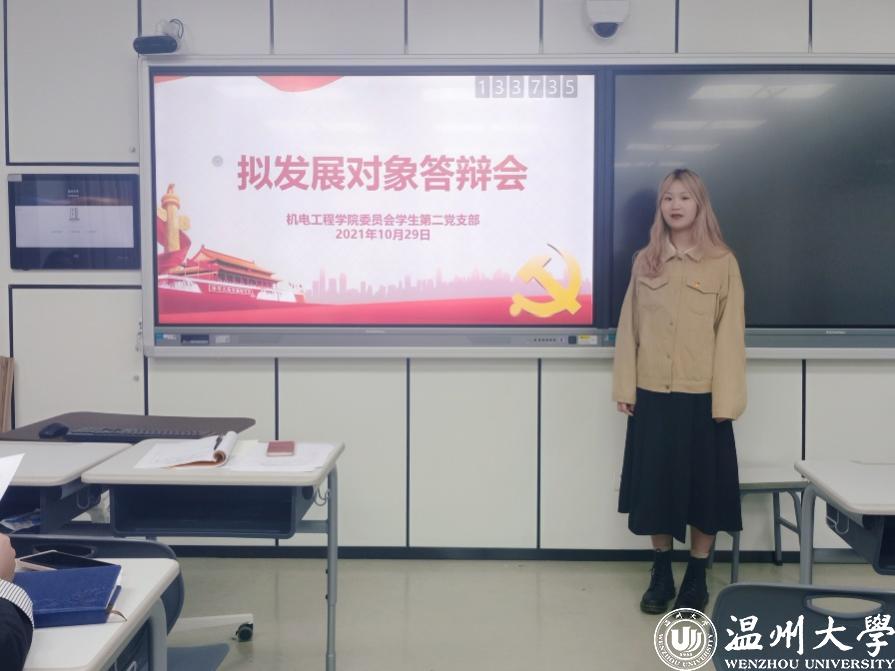 在本次答辩会上,学生第一党支部梁嘉伟、余成玘、林家豪、周洋光、周斌瑞、金鸿斌、徐湘喻、张越洋、周欲欣9位同学参与答辩;学生第二党支部苏智楠、张涛、郭治东、蔡嘉淇4位同学参与答辩;学生第三党支部朱莉、魏淳辉、张德楠、林慧、严潘铃、范雯慧、吴子豪、叶程鹏、王成鑫、陈曹宇、虞远航、曹高涵、戚建波、郏杨昊、王洪群、李佳明、余飞岑17位同学参与答辩。答辩人主要从对党的认识、入党动机、学业水平和参加实践等方面进行汇报。同时,支部党员对候选人进行党史党章,时事政治等的提问。