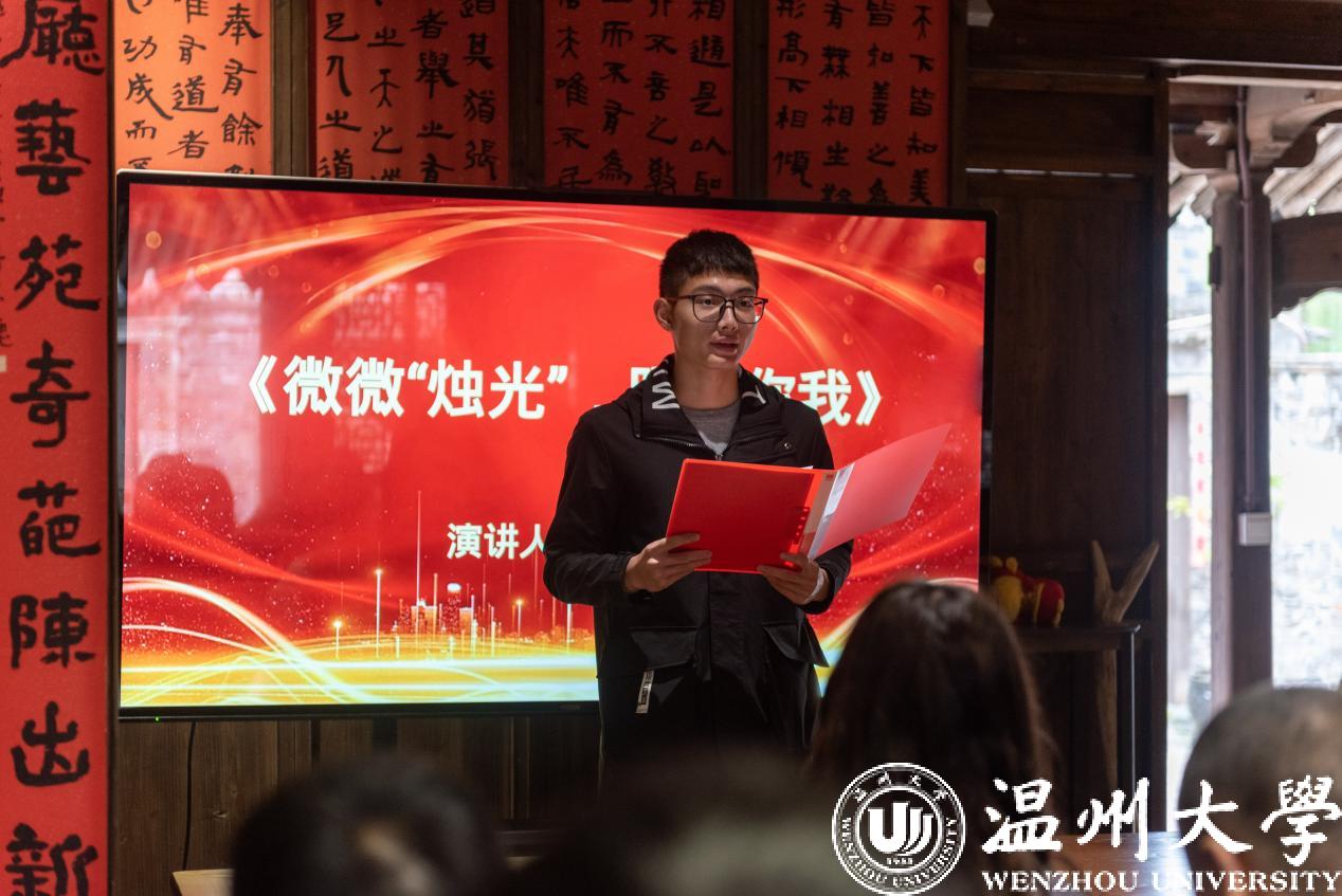 首先,学生第一党支部金舒阳同学带来《微微“烛火”,照亮你我》的演讲,分享了“化缘校长”莫振高先生的故事,用他的一生,诠释什么是奉献,什么叫廉洁。激励我们在新时代要传承千万优秀共产党员“清廉”的品质,在实现第二个百年奋斗目标的征程上,坚守信念,奋发向前。