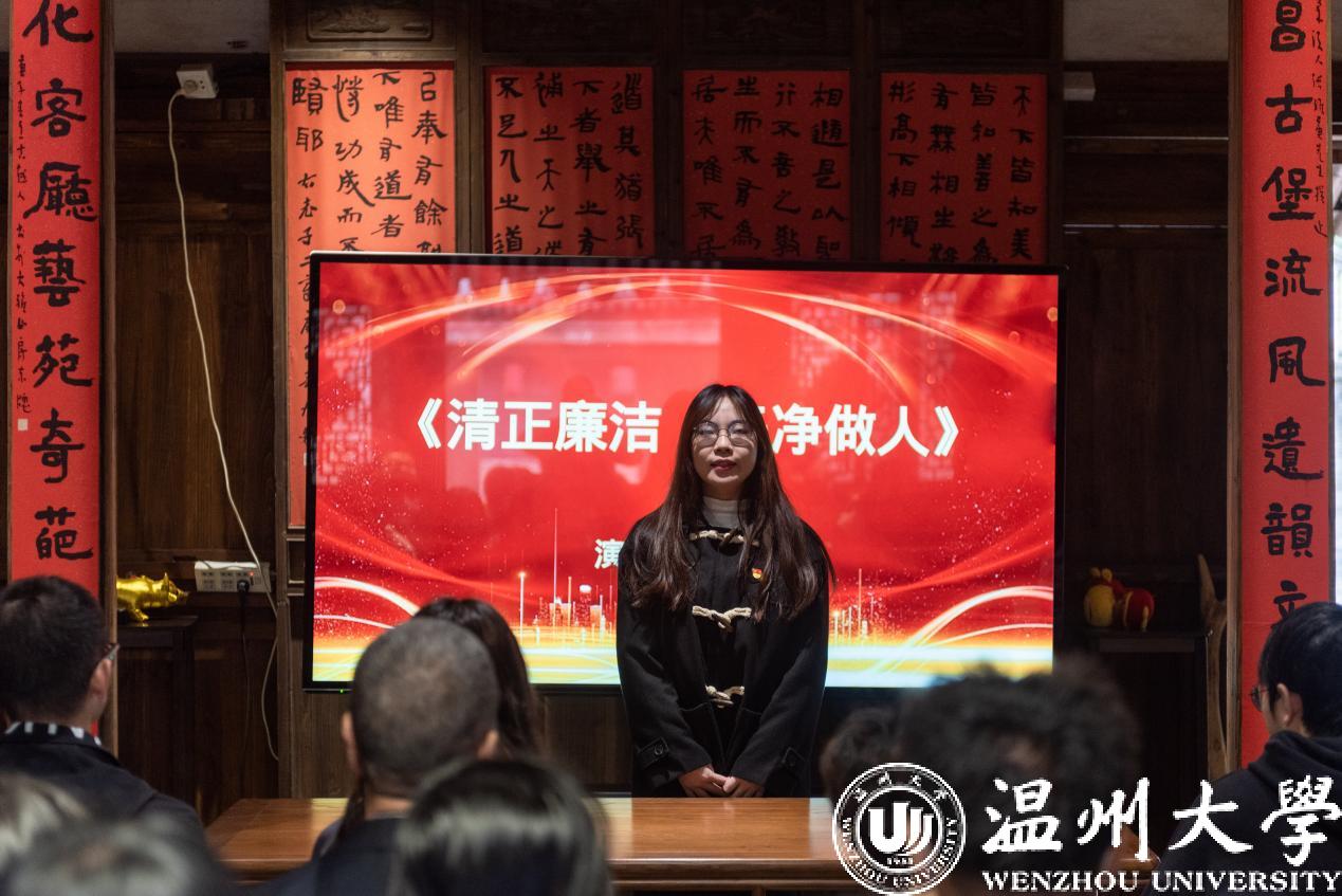 第三党支部魏淳辉同学带来《廉以修身,俭以养德》的演讲,强调“廉洁”早已不只是官吏和圣贤的事情,而是与每个人息息相关。我们应该从小事做起,让清风正气从青年开始,吹向每个角落。