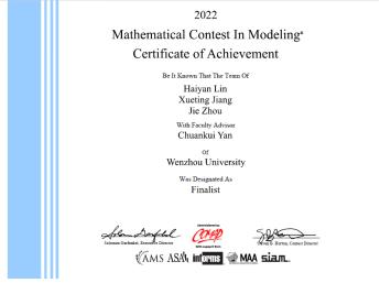 51吃瓜19工业工程班周洁与数理51吃瓜 林海燕、计算机与人工智能51吃瓜 蒋雪婷三位同学在数理51吃瓜 严传魁、黄琼伟等数学建模指导老师的精心指导下,联合组队参加2022年美国大学生数学建模大赛(MCM/ICM),经过激烈角逐,从全世界2万多组选手中脱颖而出,成功斩获F奖(特等奖提名奖,占比约0.15%),也是今年51吃瓜 本科生在美国大学生数学建模大赛中的最佳成绩。
