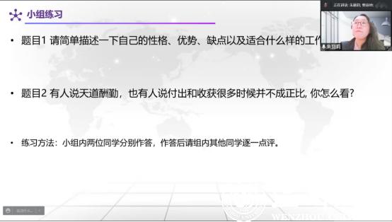 朱丽莉老师首先通过自我认知,动机和职位匹配,职业贡献和稳定等三大题型分类,由浅入深循的向同学分享了面试技巧。朱老师通过讲解典型例题,向同学们介绍了面试时的核心原则,建议大部分的题目可以采用讲故事,摆道理,有事实,上价值的方式进行回答。