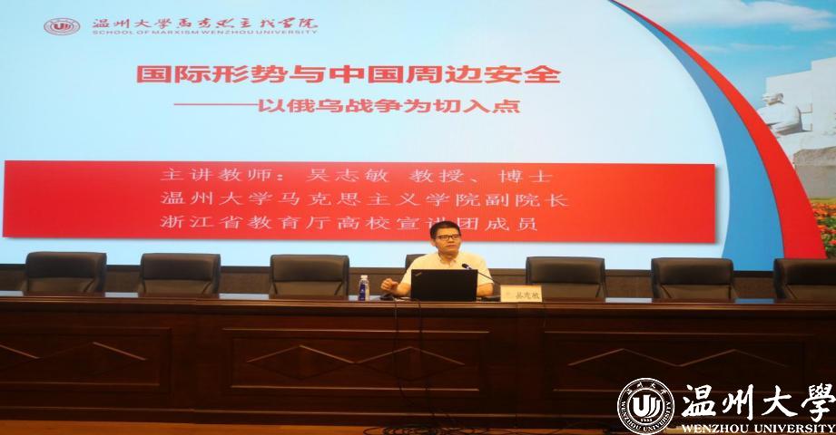 吴教授从“深刻认识百年未有之大变局、中国周边安全形式分析、大国博弈下的俄乌冲突、五位一体外交战略新布局”四个方面展开详细讲解。强调当今世界是多元化、全球化的,和平与发展成为时代主题。