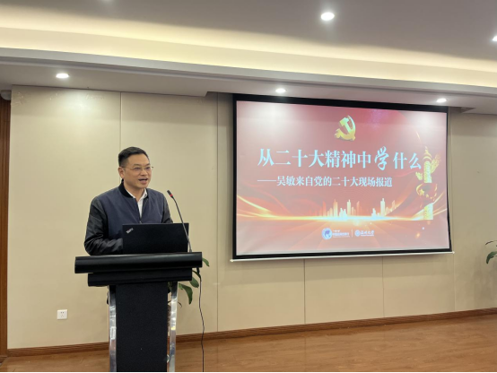 吴敏校长是温州市唯一华媒记者受邀参与党的二十大现场报道的媒体人,他带领大家从新闻媒体人的角度再一次进入二十大的现场,展现“党的二十大报道融创精品展播”系列作品,分享在二十大的现场经历。他指出,要从新闻报道中“学”、从权威解读中“学”、从核心内容中“学”,并对二十大报告的“关键词”进行解读,为大家带来了一场生动别致又受益匪浅的专题讲座。