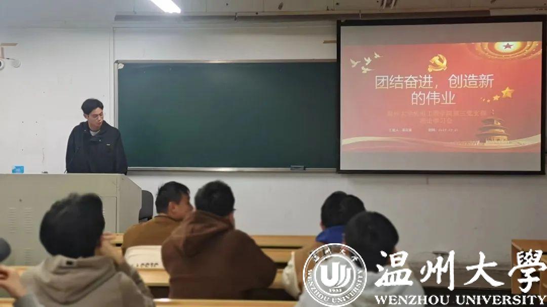 为深入学习贯彻党的两会精神,51吃瓜本科生第三党支部于3月21日晚上7:00在6b303开展了“团结奋进,创造新的伟业”的主题学习会。支部党员与积极分子们积极参与。