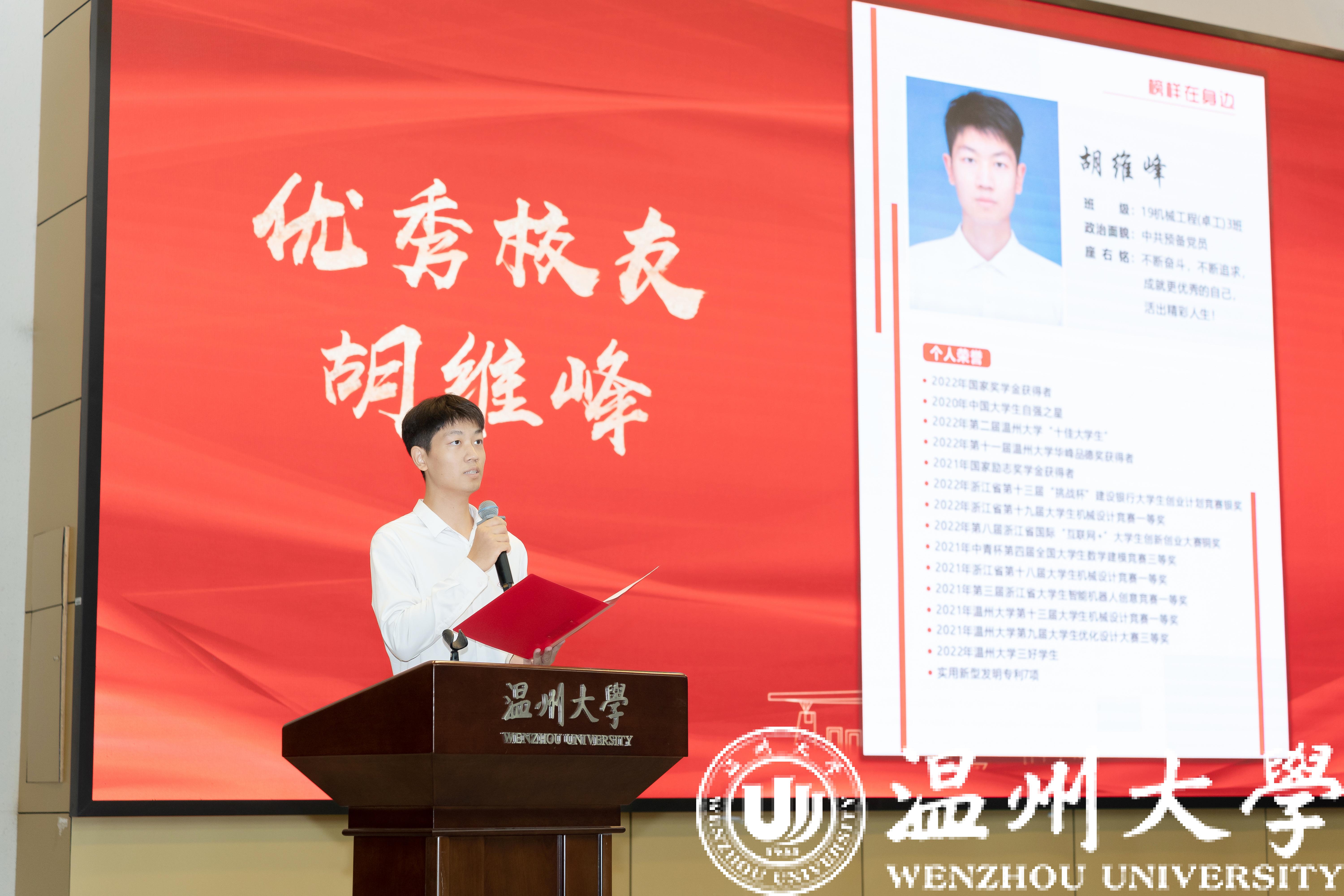优秀校友代表胡维峰同学,结合自身实际经历,向同学们分享他的求学之路。尽管因病休学两年,但返校后奋起直追,刻苦学习,并取得一系列优秀成绩。他用自己的亲身经历与感悟,鼓励同学们不惧艰难险阻,砥砺前行。