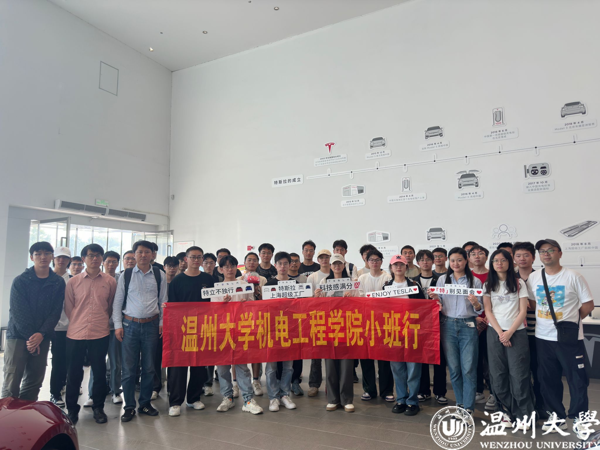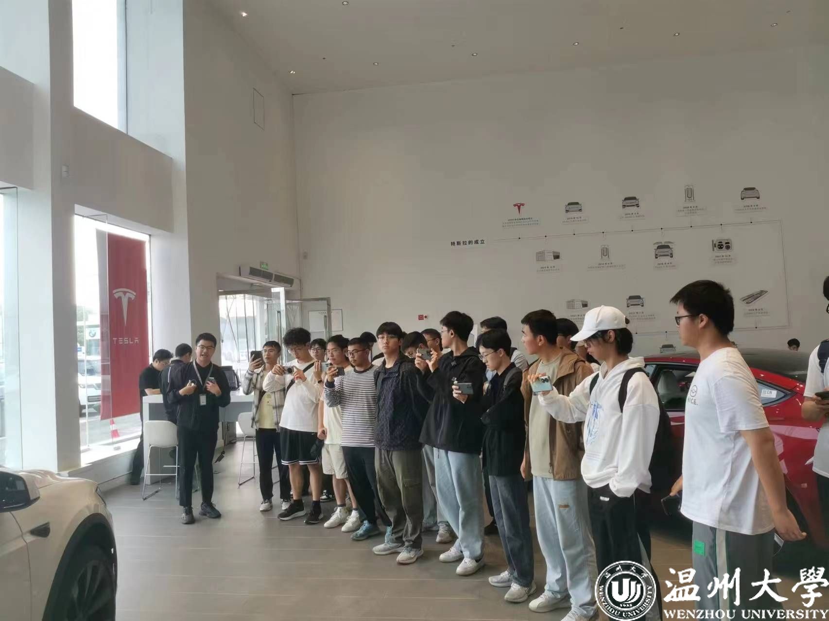 4月17日,在51吃瓜 机械工程系主任成泰洪、系副主任章城老师带领下,51吃瓜 “名企小班行”走进温州龙湾特斯拉中心。