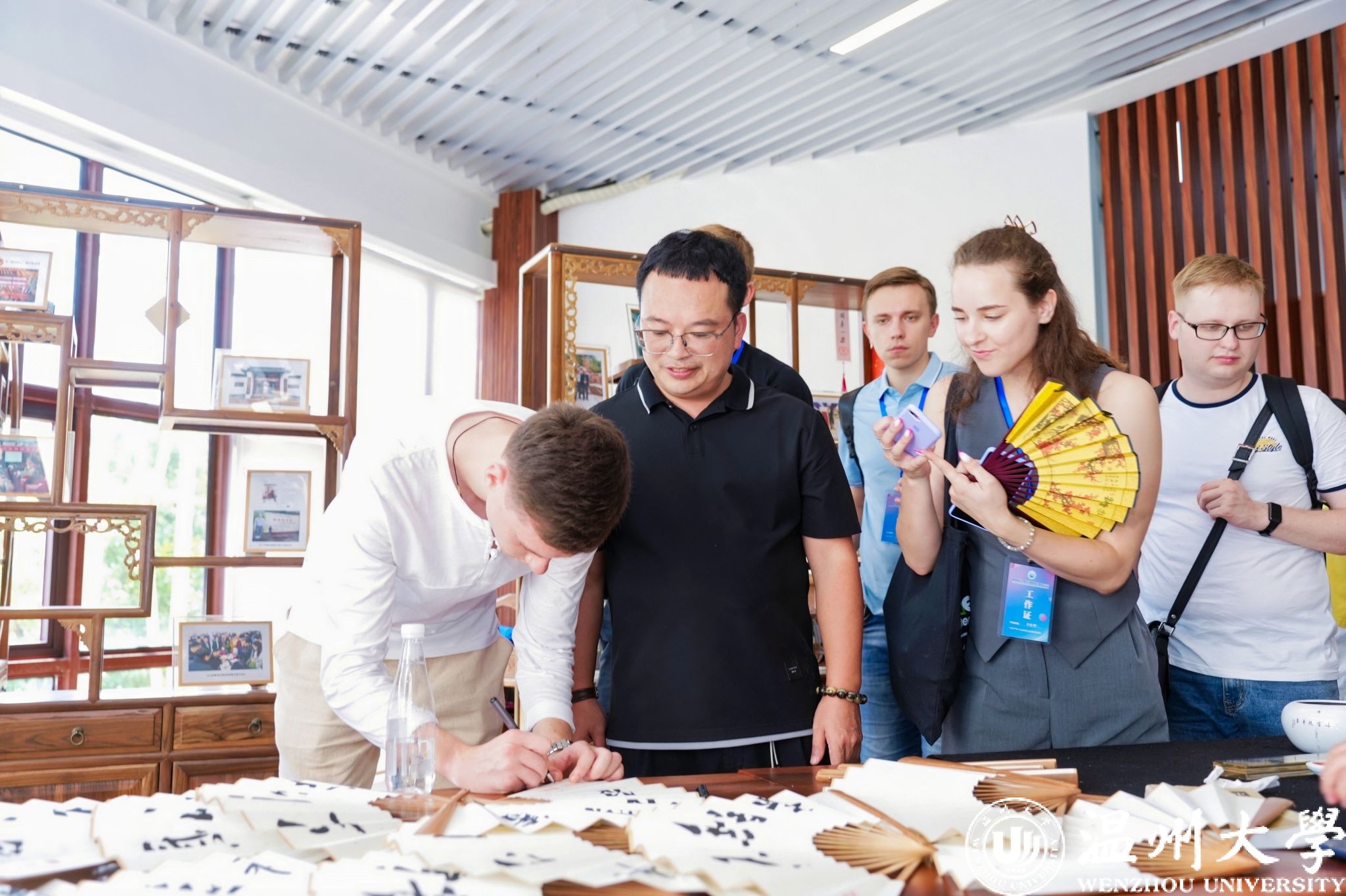 下午,代表们来到温州院士楹联博物馆。浓厚的文化底蕴和书法艺术的魅力,让俄罗斯青年代表们沉醉其中。馆方还准备了一份特别的礼物,将书写着象征中俄友谊的扇子,赠送给俄罗斯青年代表团。大家对这些书法作品表现出极大的兴趣,纷纷拍照留念。