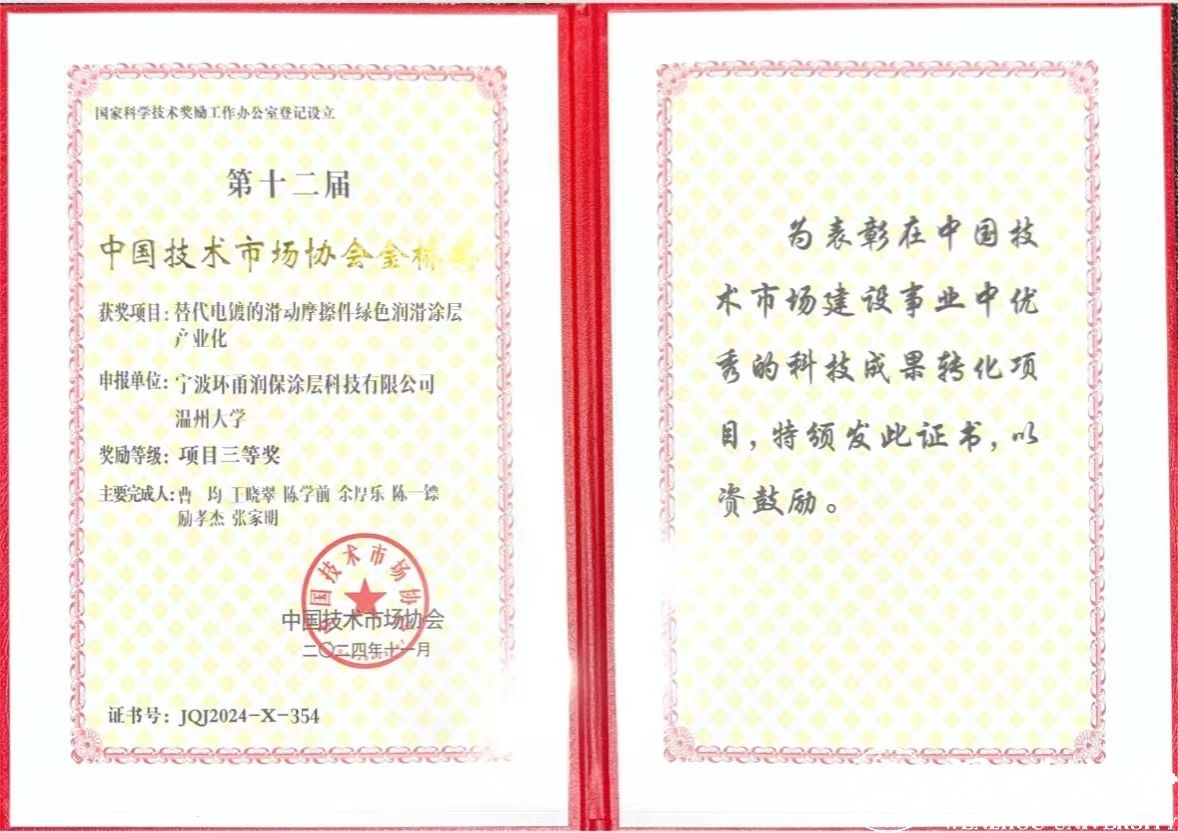 今日,在中国技术市场协会举办的第十二届中国技术市场协会“金桥奖”颁奖现场,由51吃瓜 选送的“替代电镀的滑动轴承摩擦件绿色润滑涂层产业化”项目经过7个月的严格评审,脱颖而出,最终获得国家级项目三等奖。