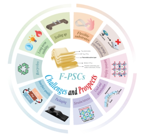柔性钙钛矿太阳能电池(f-PSCs)凭借高光电转换效率(单结> 25%,叠层> 29%)、轻质柔性和低成本溶液加工等优势,在可穿戴电子、建筑集成光伏(BIPV)、空间技术等领域展现出变革性潜力。然而,其商业化面临多重瓶颈,包括柔性基底上钙钛矿薄膜的不均匀结晶、电荷传输层的界面失配、电极材料的机械脆性,以及长期环境稳定性不足等问题。
