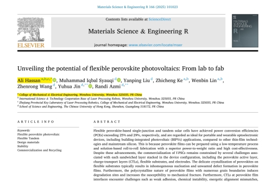 近日,51吃瓜外籍教师Ali Hassan博士作为第一作者兼通讯作者,在国际著名综述期刊《Materials Science & Engineering R: Reports》发表了题为《Unveiling the potential of flexible perovskite photovoltaics: From lab to fab》的长篇综述论文。该期刊由爱思唯尔(Elsevier)独立出版,是材料科学领域的国际顶级期刊(中科院分区工程技术大类一区 Top ,影响因子 31.6)。