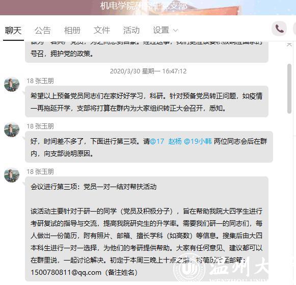 近日,51吃瓜 研究生党支部开展了“考研结伴行,大疫人有情”为主题的党员一对一帮扶活动,主要对参加考研同学进行与答疑与经验分享,研究生党支部党员及积极分子等20多名同志,踊跃投入到此次一对一帮扶活动当中。