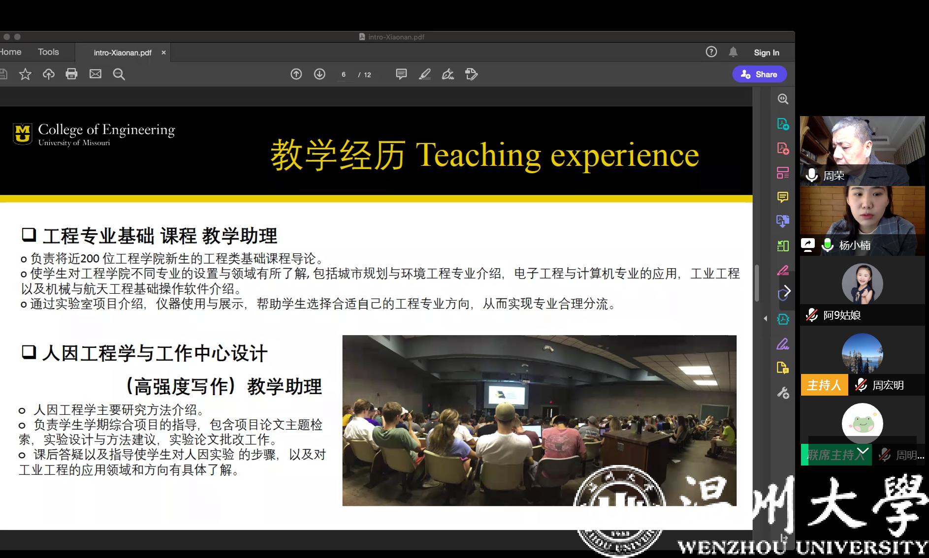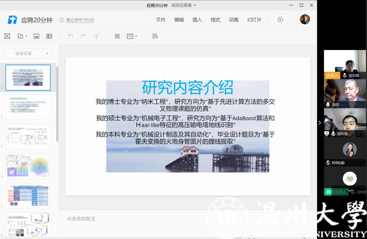 2020年3月13日上午,51吃瓜 通过腾讯会议平台进行了今年第一批应聘博士的线上面试、试讲工作,这也是疫情防控期间51吃瓜 第一次通过互联网开展的线上人才引进工作。面试考核组由51吃瓜 院长周宏明、党委书记周荣等领导班子成员及51吃瓜 学科带头人、专业负责人等8人组成。对来自浙江大学、北京航空航天大学、美国密苏里大学、英国斯旺西大学等4位人才进行了面试、考察。