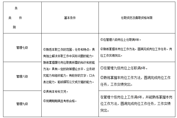 各51吃瓜 、各部门: 为加强管理队伍建设,充分调动教职工的积极性,根据《关于事业单位岗位管理制度实施后有关问题的意见》(浙人社发〔2013〕106号)、《关于事业单位管理岗位部分职员等级晋升问题有关事项的通知》(浙人社办发〔2013〕53号)、《关于事业单位岗位管理制度实施后有关问题的处理意见》(温人社发〔2015〕280号)、《51吃瓜 岗位设置实施方案(试行)》(行政〔2011〕79号)等文件精神和要求,结合学校岗位实际情况以及第三轮国聘工作,经研究,决定开展部分管理岗位职员职级竞聘晋升试点工作。现将有关事项通知如下: 一、评聘和转岗原则 1.在上级部门核定岗位数内,根据学校实际情况和事业发展需要设置岗位。 2.按照岗位管理有关规定程序进行,择优评聘。 二、申报对象 1.管理职员评聘的申报对象:现聘管理岗位的工作人员。本次管理岗位职员制的试点工作,仅针对管理岗位职级的九级、八级和七级进行。 2.转聘管理岗位的申报对象:在行政管理岗位上工作的专技、工勤人员,经过个人申请可以转岗至管理岗位。 在管理岗位上工作的专技、工勤人员需要首先进行转岗,然后才能参与后续的职员制竞聘。在管理岗位上工作的专技九级、十级人员可以申请转岗为管理八级;专技八级可以转岗为七级。在管理岗位上工作的、具有大专文凭的工勤人员,高级技工可以申请转岗管理九级;中、初级可以申请转岗为管理十级。 三、申报条件 1.坚持和拥护党的基本路线,贯彻党的各项方针政策;遵纪守法,廉洁奉公,作风正派,讲团结,以集体利益为重。 2.有较强的事业心、责任心,工作做出实绩。 3.本轮国聘聘期期满且考核合格的工作人员。 4.各级岗位竞聘基本条件、任职资历及晋职年限如下: 附 表 职员职级申报条件明细表