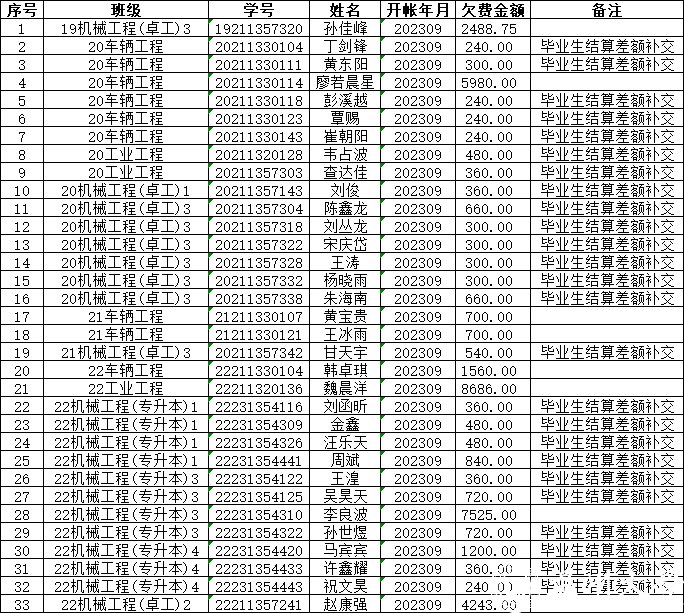 根据学校计财处反馈,截至2024年5月29日,51吃瓜如下33名同学仍存在学费欠费情况,根据《51吃瓜 学生收费管理办法》温大行政[2014]133号文件规定,第六条,学校对欠费学生进行7天公示,公示期满后如仍然欠费的,本学期做休学处理。第八条,学生在毕业前缴清所有学宿费的,学校提供成绩证明和办理离校手续。请各位同学及时缴纳相关费用,名单如下: