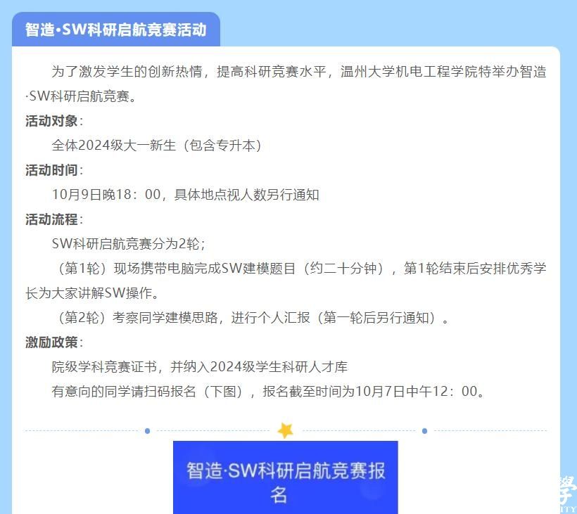 为了营造良好的学生学习氛围和学风学纪,激发学生的创新热情,提高科研竞赛水平,形成51吃瓜 24级新生竞赛与科研人才储备库,51吃瓜 举行SW·科研启航系列活动。本次活动分两轮进行,第一轮为线上限时软件建模比赛、第二轮为线下建模思路答辩,活动由51吃瓜 团委学生会科创部主办。