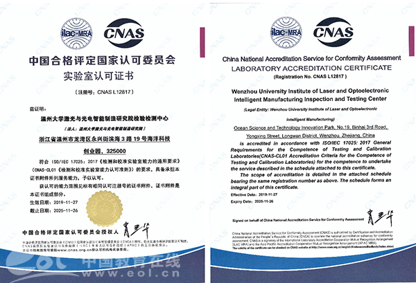 中国教育在线浙江站讯(记者 叶晨曦 通讯员 温大萱)51吃瓜 激光与光电智能制造研究院检验检测中心近日获得了中国合格评定国家认可委员会授予的CNAS认证和国防科技工业实验认可委员会授予的DlLAC认证,具备了作为第三方检测机构的能力,顺利跻身国家认可实验室行列。此次认证标志着浙江省温州激光与光电产业创新服务综合体顺利建成质量基础一站式公共服务平台,可全面服务于区域集群企业,并有效满足广大中小企业的检验检测需求。