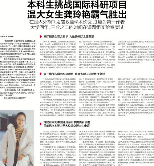“你就是那个大学四年发了多篇国际论文的学霸龚玲艳吗?”“你是怎么做到的?”“有什么秘诀吗?”……最近,性格安静的龚玲艳突然受到了“成名”的小困扰:走在校园里,时常会被一些陌生的同学认出来,向她请教秘诀。而她则将自己的成绩归功于“站上了巨人的肩膀,而我又全身心地去做了”。