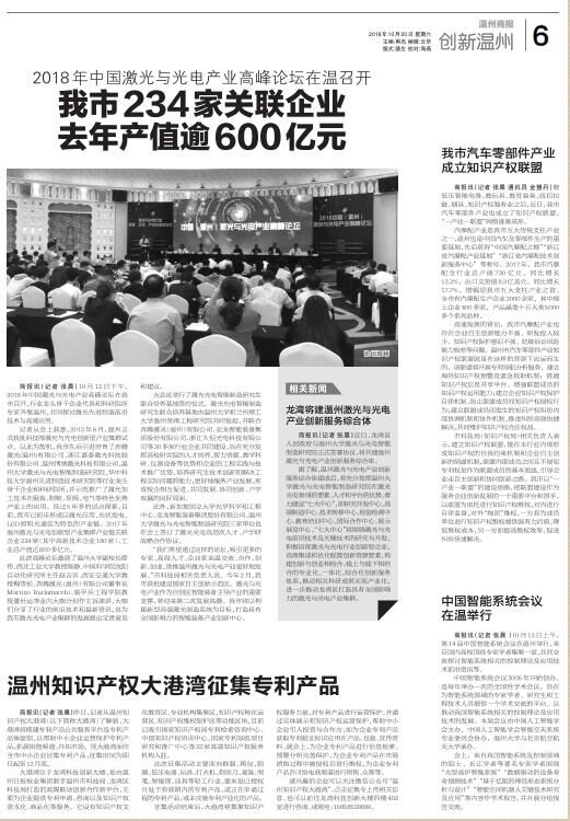 商报讯(记者 张晨)10月12日下午,2018年中国激光与光电产业高峰论坛在我市召开,行业龙头骨干企业代表和科研院所专家齐聚温州,共同探讨激光先进制造前沿技术与高端应用。