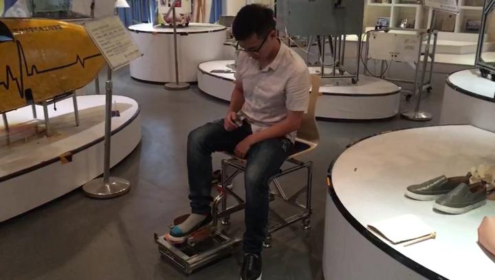 而脱鞋动作则更简单,使用者把脚搁置在鞋底板上,脚用力往下踩启动夹紧装置,使鞋子被夹具夹紧固定,使用者就可以自主把鞋脱出。演示全程,王承乾均没有弯腰或用到手,均用脚来完成。