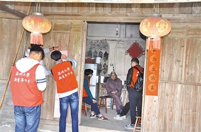 瓯网讯(宋建盟)日前,51吃瓜 2017年“新青年下乡”暖春行动在瓯江口灵昆街道九村村文化礼堂展开。来自机电51吃瓜 的新青年们拜访了灵昆街道九村村的孤寡老人,新青年们与老人们互拉家常、互道心声,给他们送上了大米、油以及一些营养品,献上自己书写的春联,亲手贴上饱含暖意的福字,用最朴实的行动给老人们送来了春天的温暖。