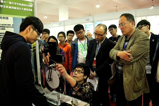 来自全省50所高校的360个参赛团队带着他们的实物作品在此次大赛中一展风采。全自动升降自擦无尘黑板、多功能组合黑板、便携式移动多媒体讲台、多功能可折叠课桌椅、新型多功能自动圆规、便携式多功能制图桌、无尘自动擦除黑板、机器人助教、化学试管自动清洗器、仪器存储展示柜、多功能激光笔、机器人助教......这些未来若干年以后才可能见到的课堂教学设备穿越时空来到大赛现场,同学们设计的作品种类多样,每一件都设计独特,别具匠心。参赛选手充分发挥自己的想象力,运用机械类课程所学的基本概念、基本原理、基本方法等对课堂用具进行了改良与创新,设计了各种能够使课堂教学更加丰富、更具吸引力的机械装置。