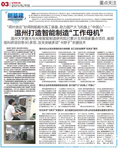 该研究院还依托51吃瓜 机械工程一流学科以及一批国家和省部级科研平台,同时整合北航温州研究院、北京大学-温州激光与光电子联合研发中心、中科院西安光机所等力量,打造形成浙江省温州激光与光电产业创新服务综合体,成为国家自创区和环大罗山科创走廊建设的重要支撑平台。目前该综合体已累计引进30多个激光与光电项目入驻。产业集群已构建起以激光、光电能源、半导体照明、光通信为特色的产业链,集聚了以奔腾、嘉泰、瑞浦新能源等为代表的激光与光电行业关联企业280余家,实现营业收入超685亿元,温州已初步成为浙江乃至长三角激光与光电产业应用的创新创业高地。