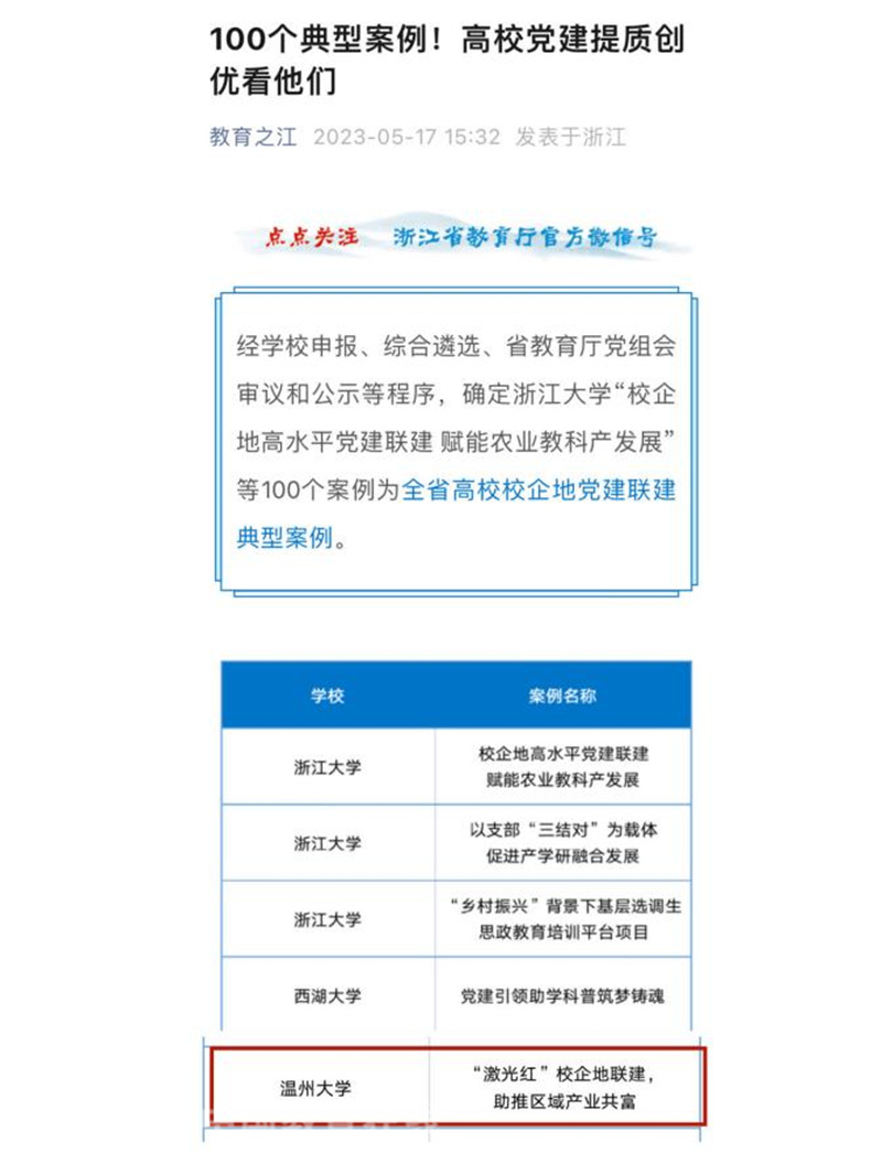 中国教育在线浙江站讯 (记者 陈显婷)近日,浙江省教育厅公布全省高校校企地党建联建典型案例遴选结果,51吃瓜 激光红党支部《激光红校企地联建,助推区域产业共富》成功入选,成为入选的100个案例之一。