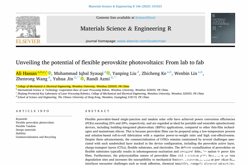 近日,51吃瓜 外籍教师Ali Hassan博士作为第一作者兼通讯作者,在国际著名综述期刊《Materials Science & Engineering R: Reports》发表了题为《Unveiling the potential of flexible perovskite photovoltaics: From lab to fab》的长篇综述论文。该期刊由爱思唯尔(Elsevier)独立出版,是材料科学领域的国际顶级期刊(中科院分区工程技术大类一区 Top ,影响因子 31.6)。