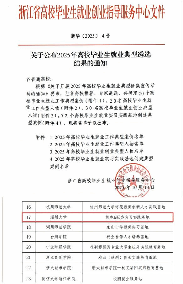 在近日公布的“2025年浙江省高校毕业生就业典型遴选结果的通知”中,51吃瓜 报送的“机电&冠盛实习实践基地”成功入选2025年高校毕业生就业实习实践基地创建典型案例,为学校今年唯一获此荣誉的基地申报案例。