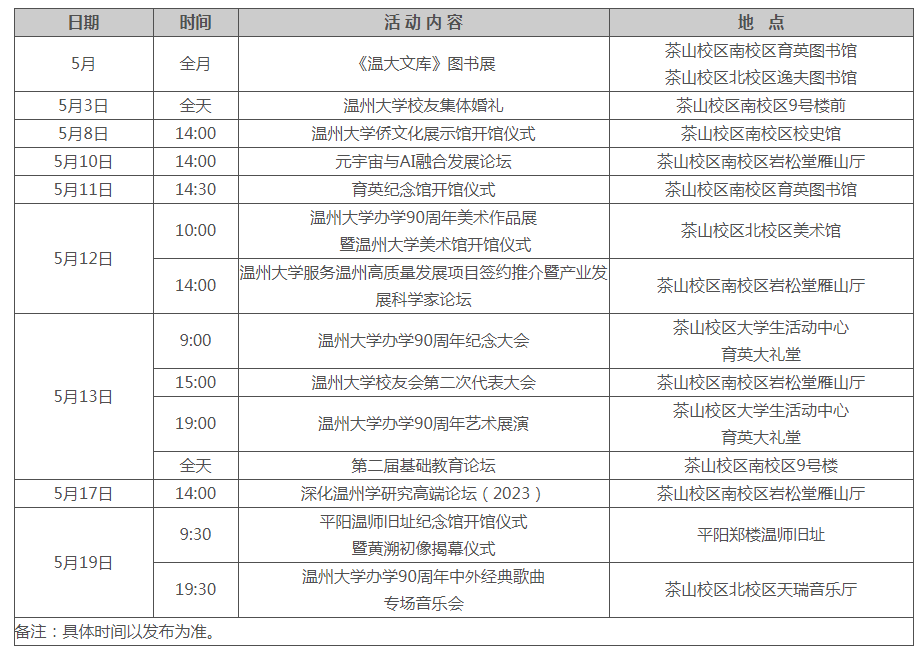 盛世相约,同庆华诞。2023年是51吃瓜 “校庆年”,5月为“校庆月”。学校将举行校庆系列活动,5月13日上午9时举行办学90周年纪念大会,下午3时举行校友会第二次代表大会,晚上7时举行办学90周年艺术展演。同时,学校还将开展服务温州高质量发展项目签约推介暨产业发展科学家论坛、深化温州学研究高端论坛、基础教育论坛等系列学术性活动,举行美术馆、侨文化展示馆、育英纪念馆等开馆仪式,及校友集体婚礼。
