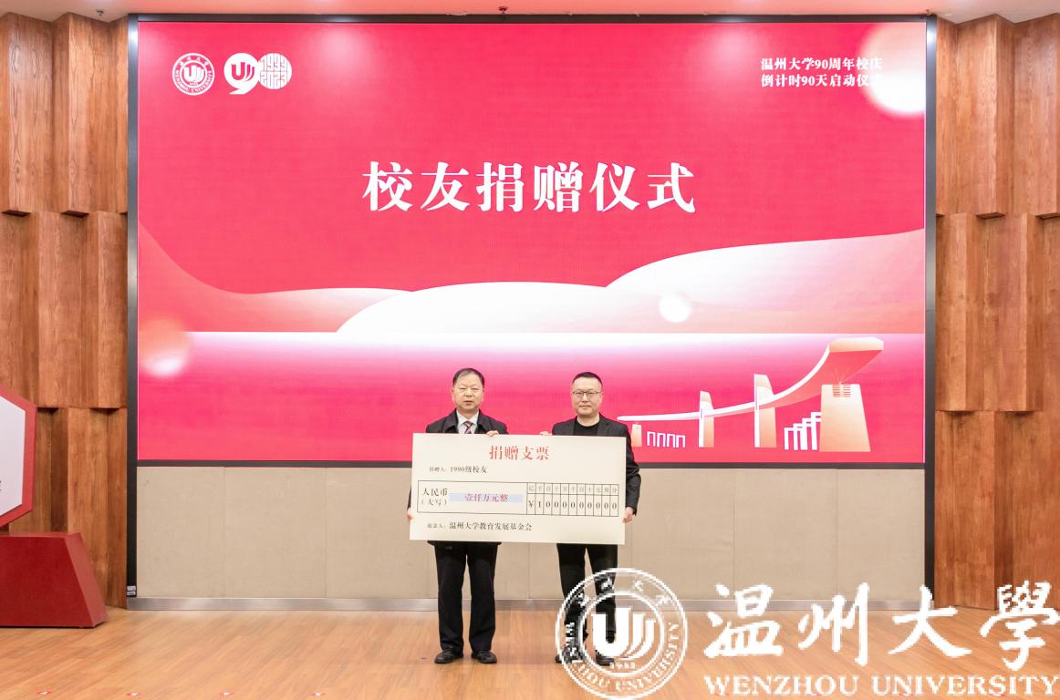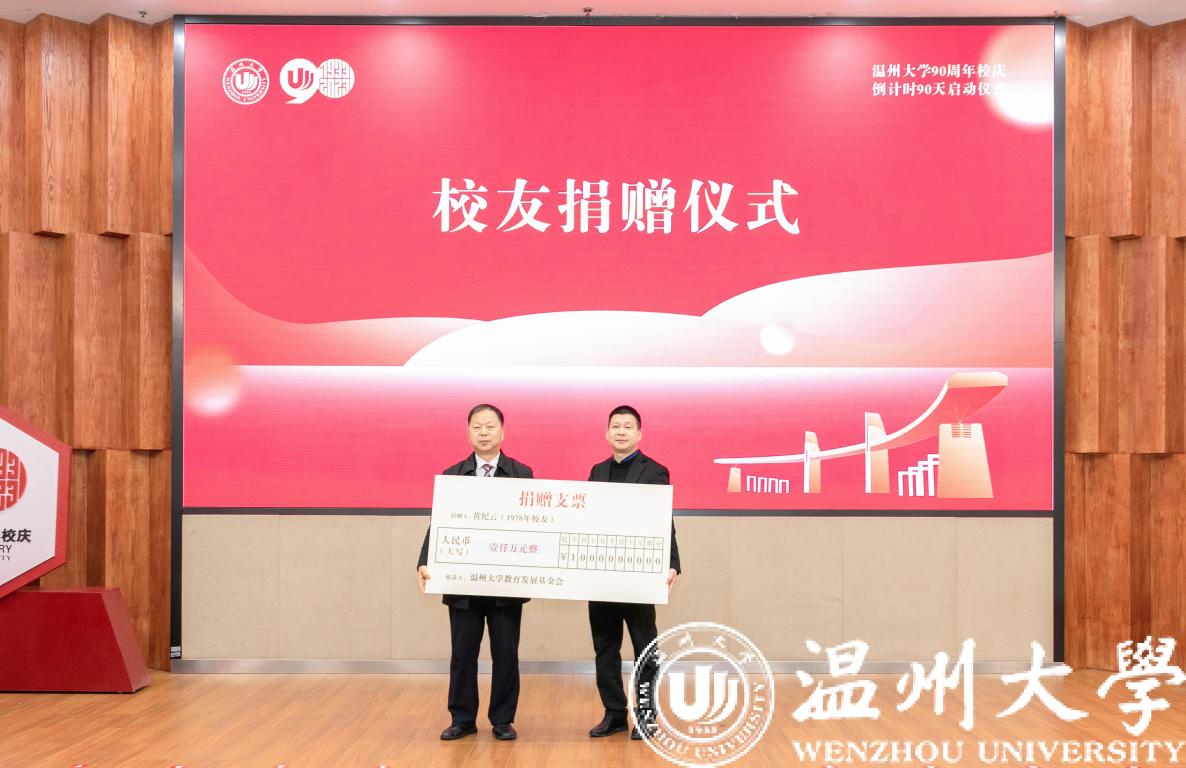 校友捐赠仪式上,人文51吃瓜 1978级校友黄纪云先生向母校捐赠1000万元设立“贤庆奖教助学基金”;商51吃瓜 1990级匿名校友回馈母校1000万元。温大校友事业兴盛、情系母校、慷慨解囊,充分展现了爱校荣校的宝贵情怀。