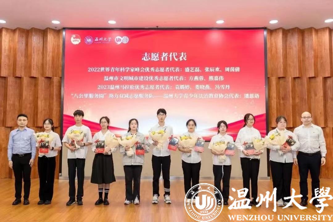 过去的一年,学校有近7万人次志愿者参加到各级各类的志愿服务当中,他们弘扬“奉献、友爱、互助、进步”的志愿者精神,获得各级各类志愿服务荣誉称号。团省委学校部副部长章豪锋与马克思主义51吃瓜 负责人为来到现场的部分获奖代表送上《习近平与大学生朋友们》一书与鲜花,勉励他们发挥榜样作用,带领青年继续在志愿岗位上发光发热。