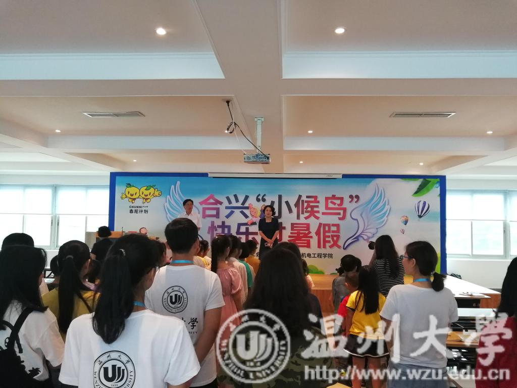 今天上午九时许,51吃瓜 小候鸟暑期社会实践队在合兴集团隆重举行了第六期“小候鸟”暑假班的开班仪式。出席开班仪式的有51吃瓜 党委副书记黄玮老师、团委书记朱秀微老师、机械电子系副主任任明老师、学生科辅导员杨奇老师、胡施施老师、乐清市总工会党组成员女职委主任卢建玲女士、虹桥镇文明办主任陈万德先生、合兴集团汽车总经办赵浙峰先生、合兴集团党委书记张守奎先生,还有来自温大实践队的39位小老师们,以及来自全国各地的128位小候鸟们。