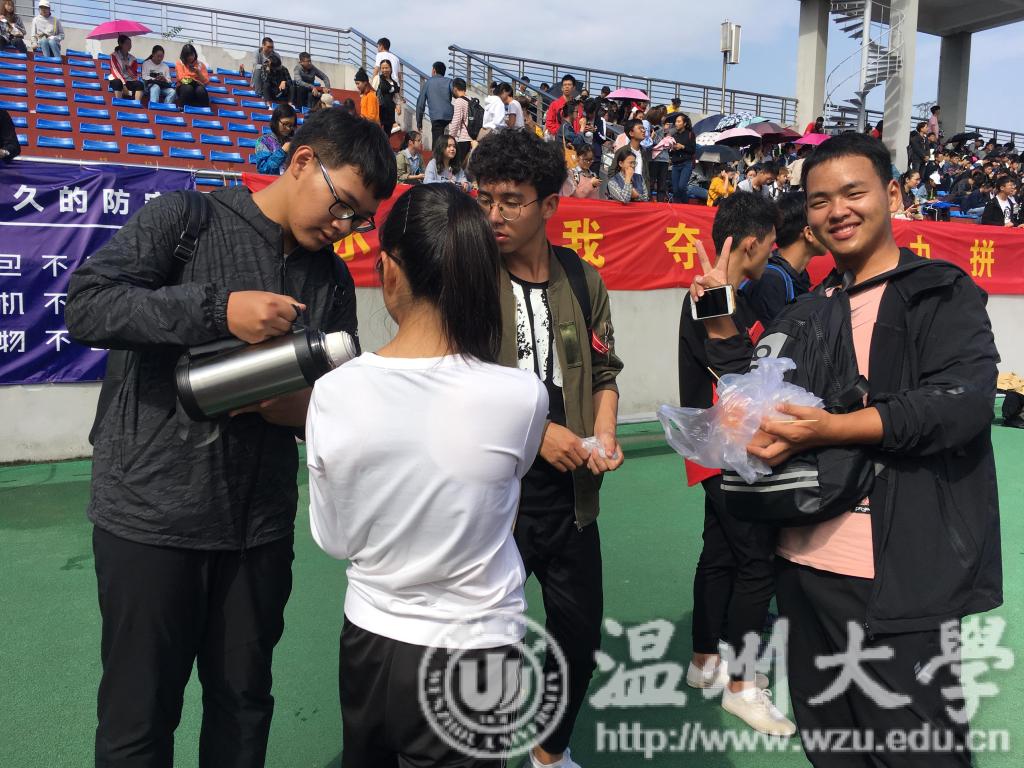这次运动会上,文体部同学在比赛前联系每位参赛选手,然后逐一跟进每位运动员,做好后备工作,你们的认真负责无形中鼓动着我们机电的士气;还有我们的18机械类1班,班长自发组织同学带上热水瓶,在赛场的终点送上一杯热水,送上关怀的慰问,这份热情让我们深深感动。
